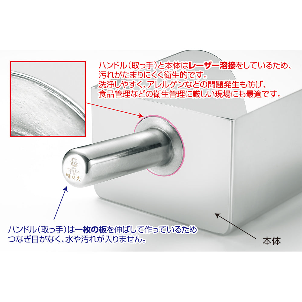●ステンレス製でさびにくく、1枚絞りハンドルのフランジを外周全体と本体を溶接する事により,汚れがすき間に入り込みにくいハンドル構造です。さらにハンドルの両サイドを平面にする事により持ちやすくなり、スコップ本体のすくい出しの際に位置も決まりやすくなりました。1枚板絞りハンドルで衛生面・洗浄しやすさを追求しました。台の上の粉も最後まできれいにすくえます。他のスコップと違い衛生面を重視されている食品加工工場、厨房、研究施設、医療施設等で使用されています。