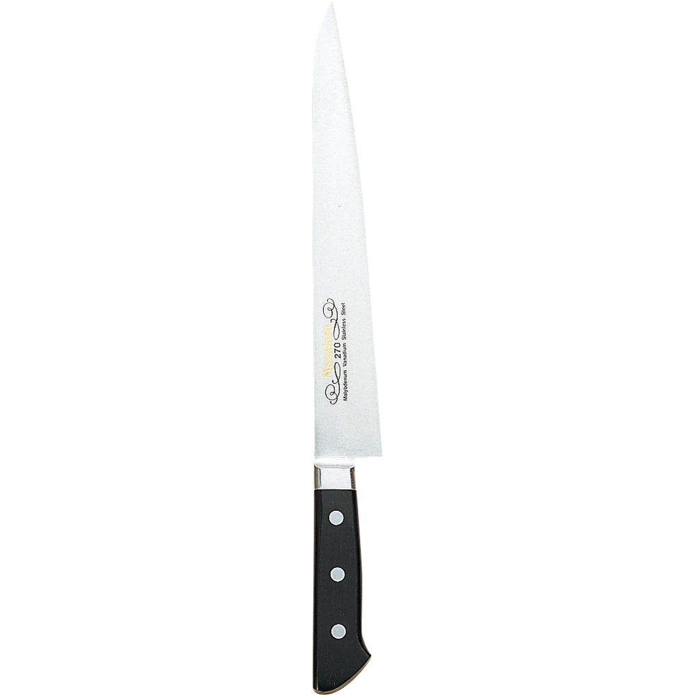 錆に強く、切れ味の持続性に優れた正広オリジナルのステンレス鋼 (MBS-26)を使用した最高級ステンレス包丁のシリーズです。手に伝わる重量感はプロの感覚そのままに、実用性を重視した本職用牛刀です。