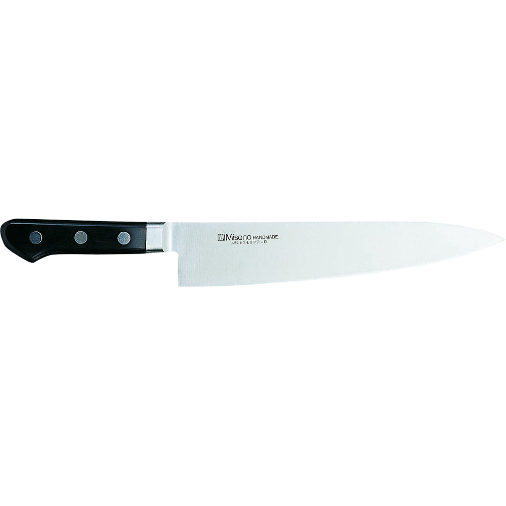 切れ味が冴え、しかもサビにくい。ミソノモリブデン鋼庖丁は、モリブデンとバナジウムの入ったハイカーボンの高級ステンレス・モリブデン鋼を使用し、ハイレベルの技術を駆使した理想の洋包丁です。刃身と一体のツバが衛生的。切れの冴えと耐久性を両立させた最高の出来ばえが、またひとつ秀作を生みました。