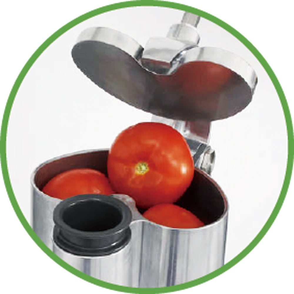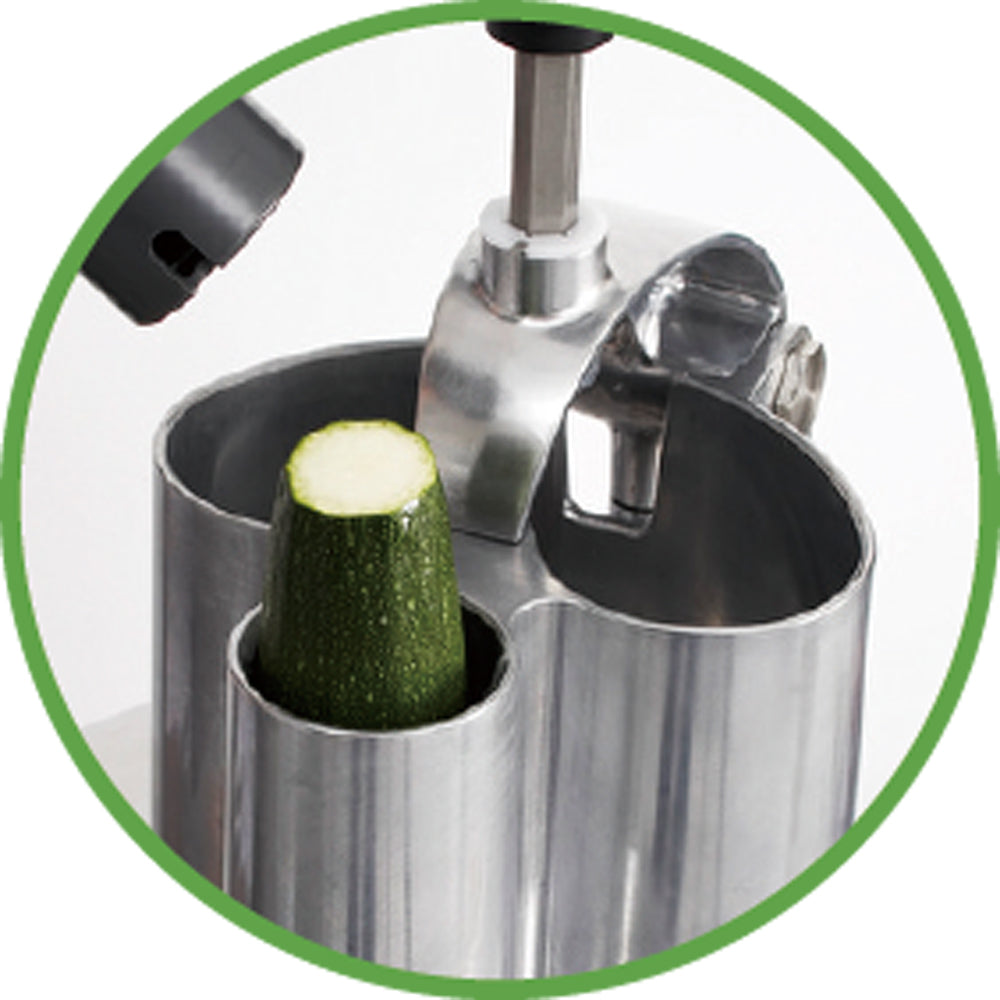 ・100V単相でテーブルトップタイプ。手間のかかる野菜カットを一時間あたり200kg切削能力。40種類のヴァリエーションを持つディスク類を組み合わせる事で、ほとんどのニーズに対応します。特にこの機器が持つ利便性としては、8x8mm、10X10mm、14X14mmなどのダイシング・カット(細の目)のカットが出来るという事です。また、テーブル上で使用する基本設計になっており、昨今増加傾向である「ドライキッチン」にも対応しており、非常に衛生的です。
