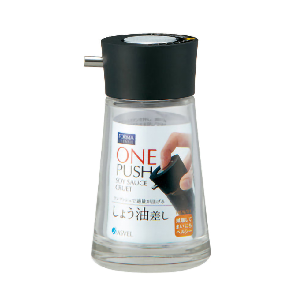 ・しょう油は日本人にとって欠かせない調味料のひとつ。料理にかけたり、食べる直前に数滴垂らしたりと、用途に応じて使用料を調節する。また健康志向を受けて、少しでも塩分を控えたいという機運も高まっている。同社ではこれらのニーズを受け、ワンプッシュで出す量を自由自在に調節できるしょう油差しを開発した。本体はガラスなので丈夫で清潔である。使いやすい容量の2サイズ(80mlと100ml)。売り場で映えるよう、デザインもシンプルながら美しい。黒・白・緑の3色。(生活産業新聞 平成22年5月1日掲載)