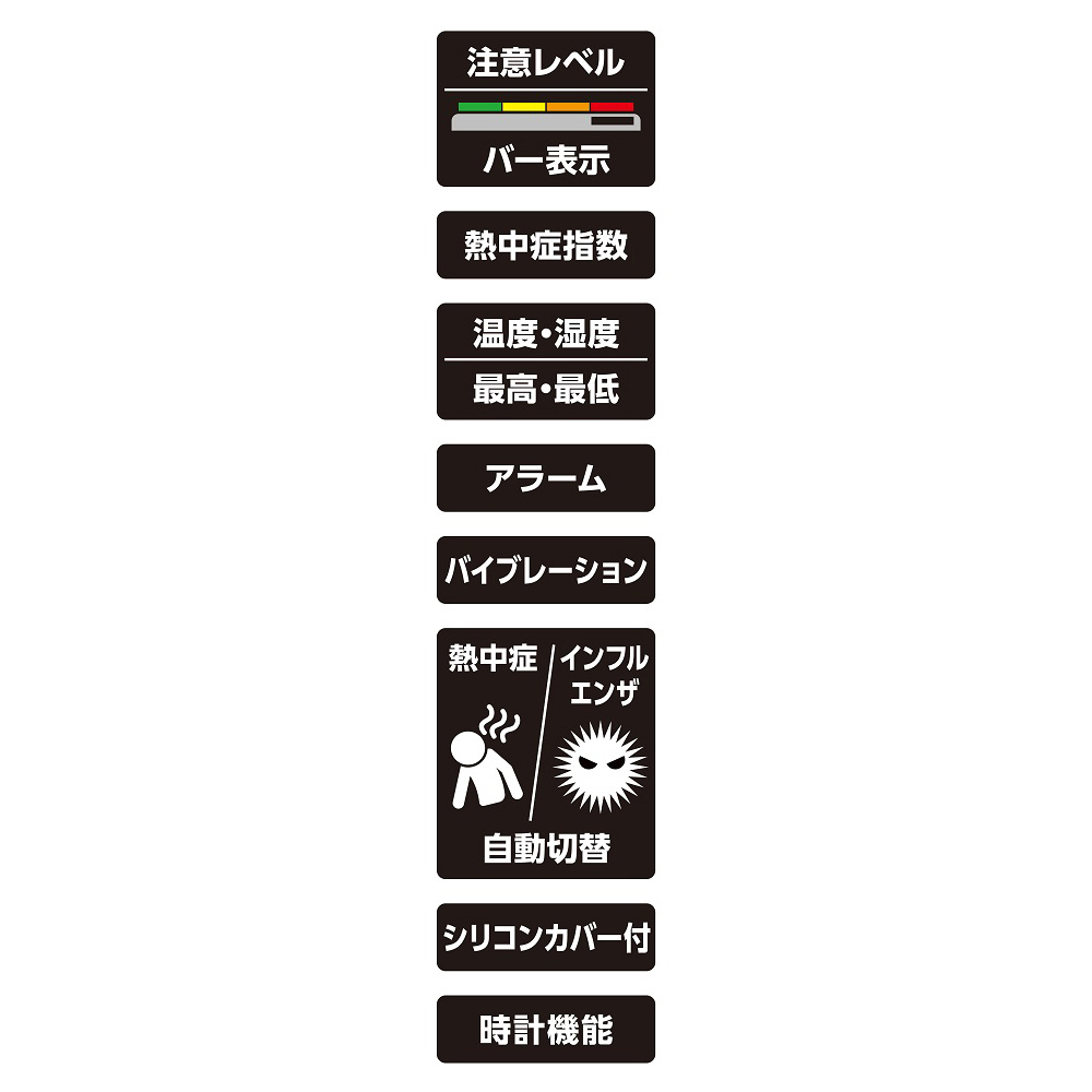 熱中症、インフルエンザの注意レベルを環境に合わせて自動で切り替え、表示とアラーム、バイブレーションでお知らせします。